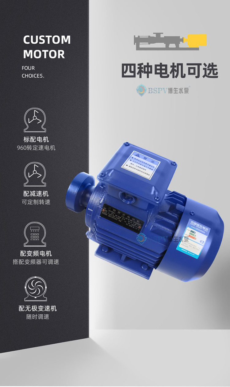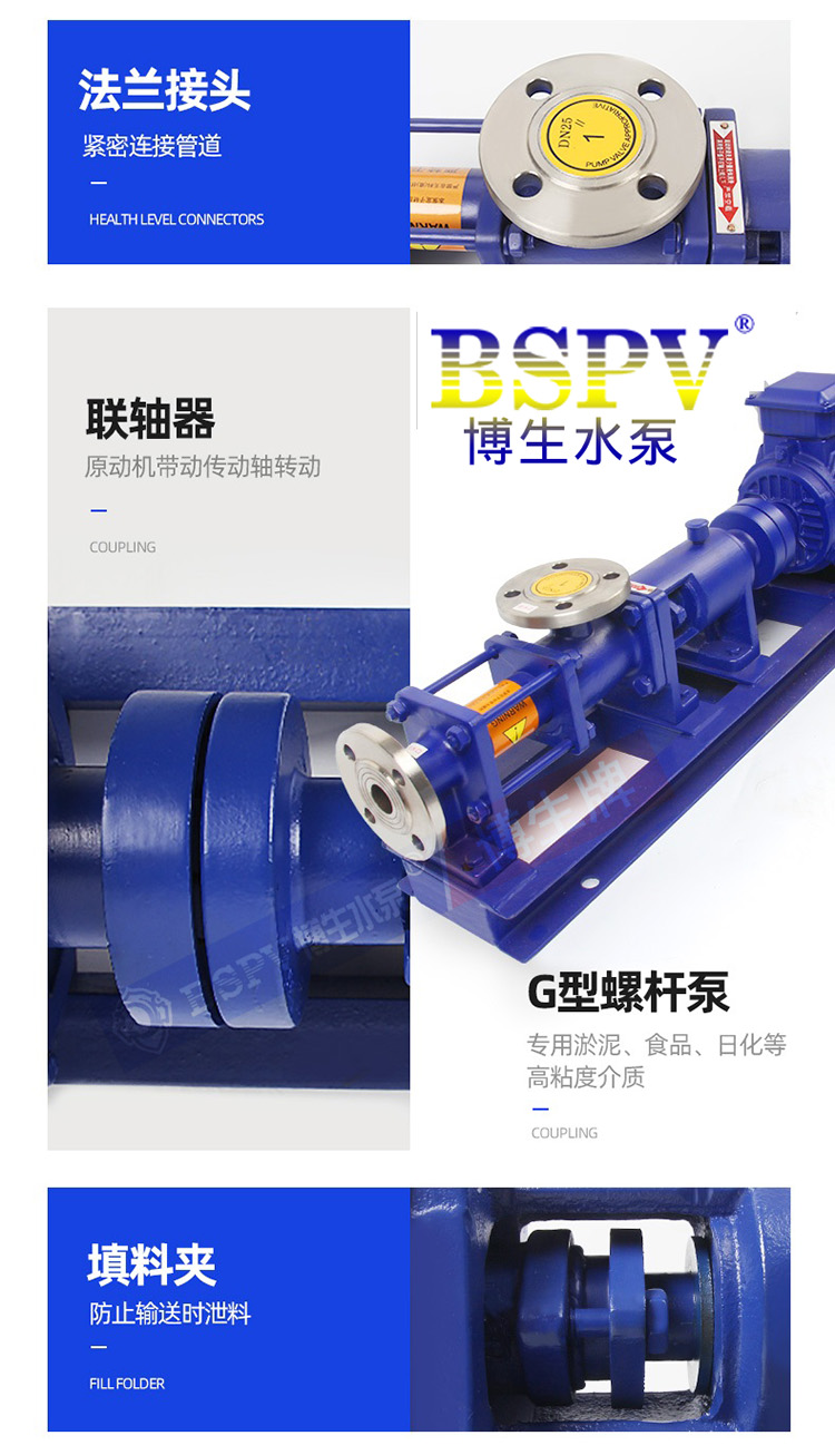 博生牌G型單螺桿泵制造標準分為食品級、化工級、日用品型、特種型等四大系列,產品的核心部件和密封裝置,根據介質的不同特性,采用不同的材質和不同的密封形式,以滿足各種物料的需要。