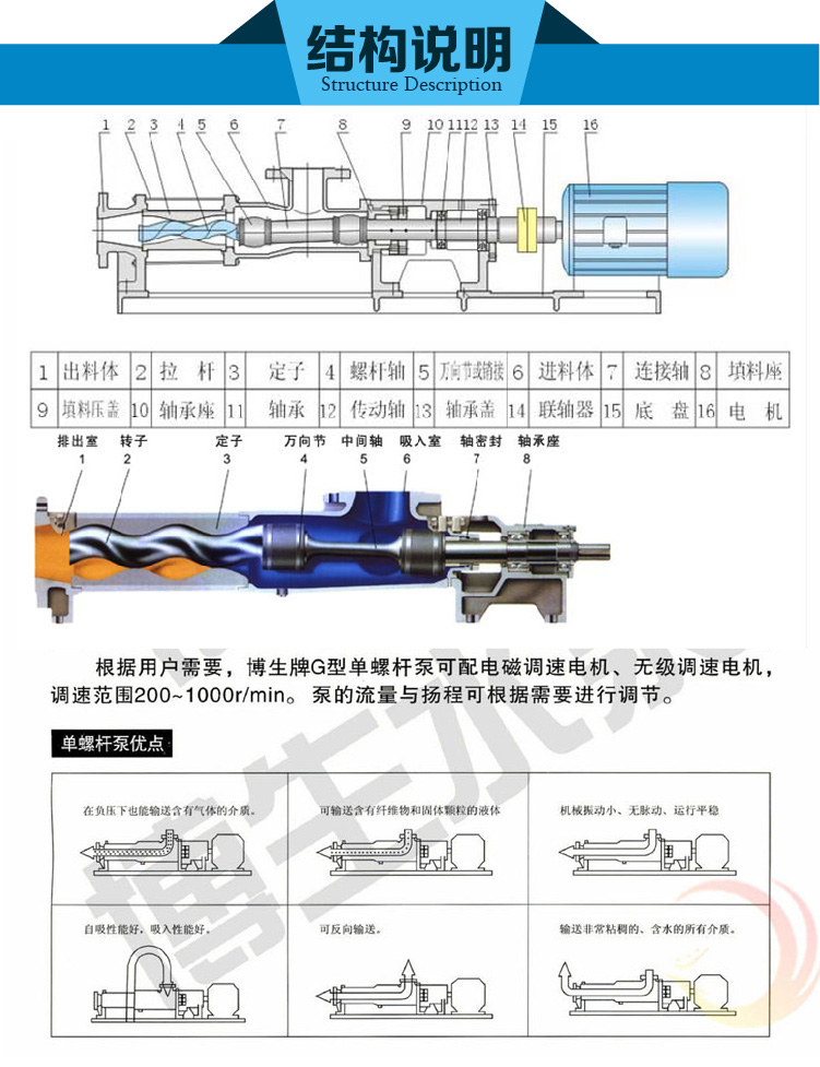 博生牌G型單螺桿泵在發達國家已廣泛使用,由于其優良的性能,近年來在國內的應用范圍也在迅速擴大。它的特點是對介質的適應性強、流量平穩、壓力脈動小、自吸能力高,這是其它任何泵種所不能替代的。目前我單位的產品已自成一體系,壓力為0.4∽1.2MPa,可滿足廣大用戶對單螺桿泵的不同需求。我單位生產的泵,質量可靠,實行三包,價格也相對較低,同時確保備件的供應。本單位熱忱為廣大用戶服務,接受用戶對特殊要求單螺桿泵的設計和制造任務。